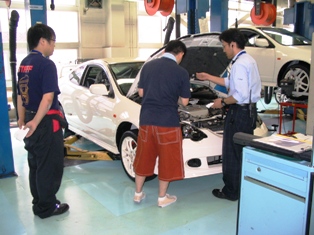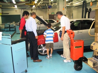 最初に教室で点検の制度や必要性、車検の制度について簡単に勉強しました。一緒に参加している小学生の子供達も、スクリーンの中で説明される内容にじっと聞き入ってくれていました。続いて本校オリジナルのテキストと日頃我々整備士が使う、「定期点検記録簿」の実物を使い、実習場にて日常点検など体感しました。自分の車のタイヤを自分で初めて外してみたり、部品のついている位置を見ながらお父さんと一緒に点検を楽しんでいました。